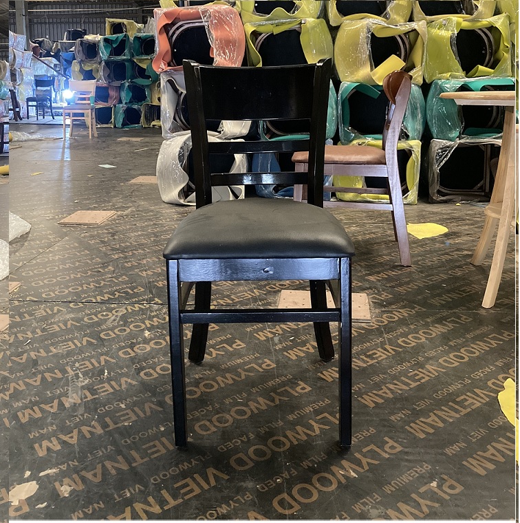 Chiếc ghế cabin đen bọc đệm thường được chế tác từ gỗ tự nhiên kết hợp nệm bọc simili hoặc da cao cấp, vừa chắc chắn vừa dễ lau chùi, thích hợp sử dụng lâu dài.